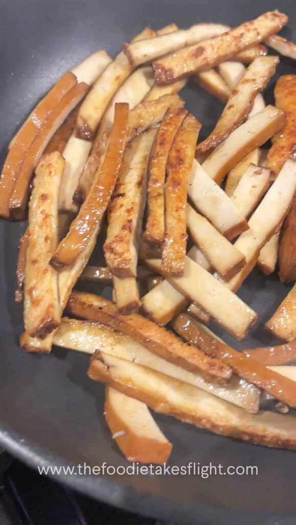 - Add some oil to the pan, pan-fry the smoked tofu and add soy sauce, to taste, and mirin. If using regular extra firm tofu, I recommend to pan fry the tofu until golden brown and season the tofu with more soy sauce.