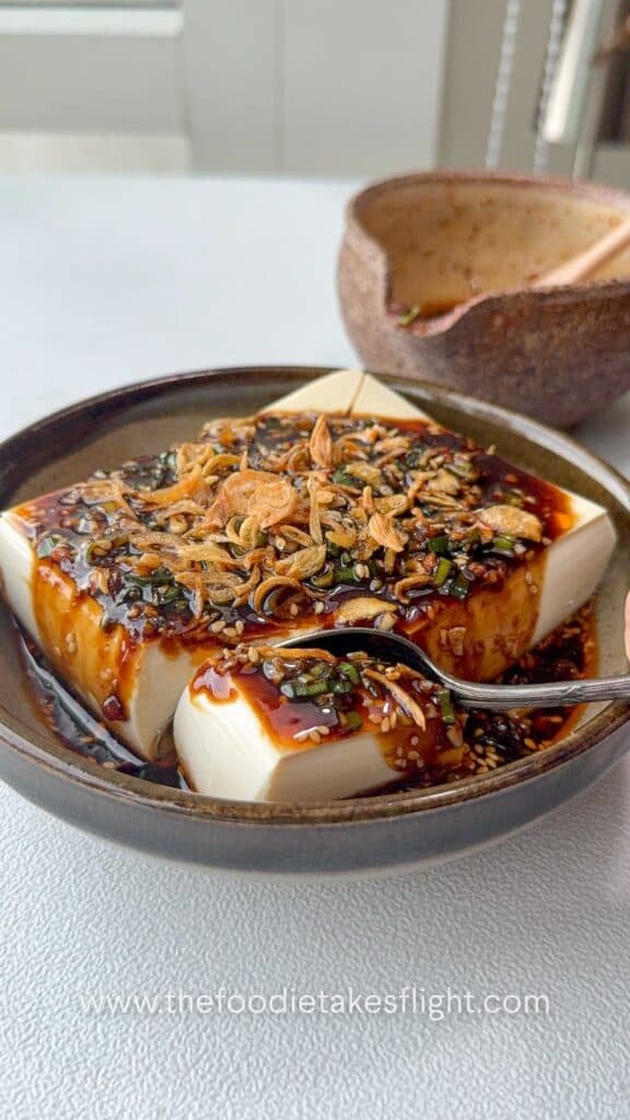All-around dipping sauce poured over cold silken tofu and topped with fried shallots