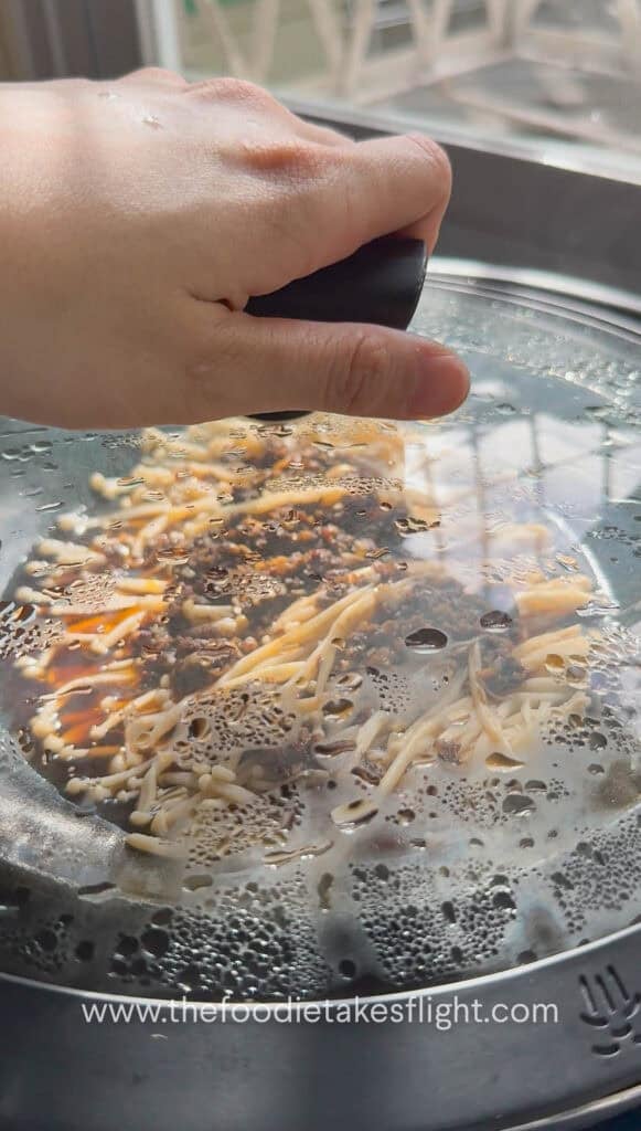 - Pour the hot garlic-chili mixture evenly over the enoki mushrooms.