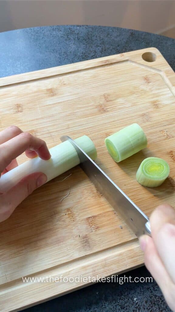 - Slice the root ends of the leek then cut into 1-inch/2.5 cm thick pieces.