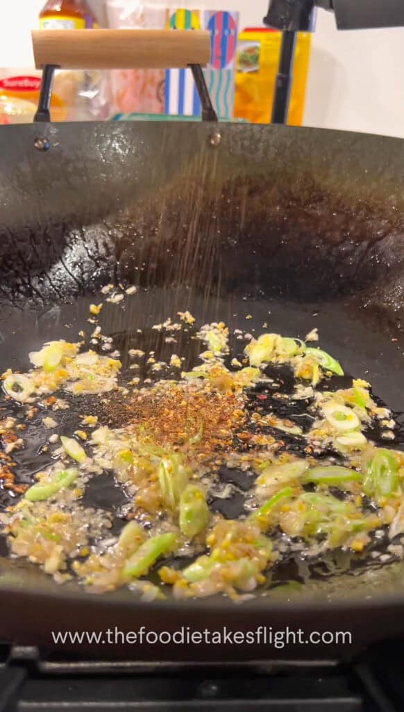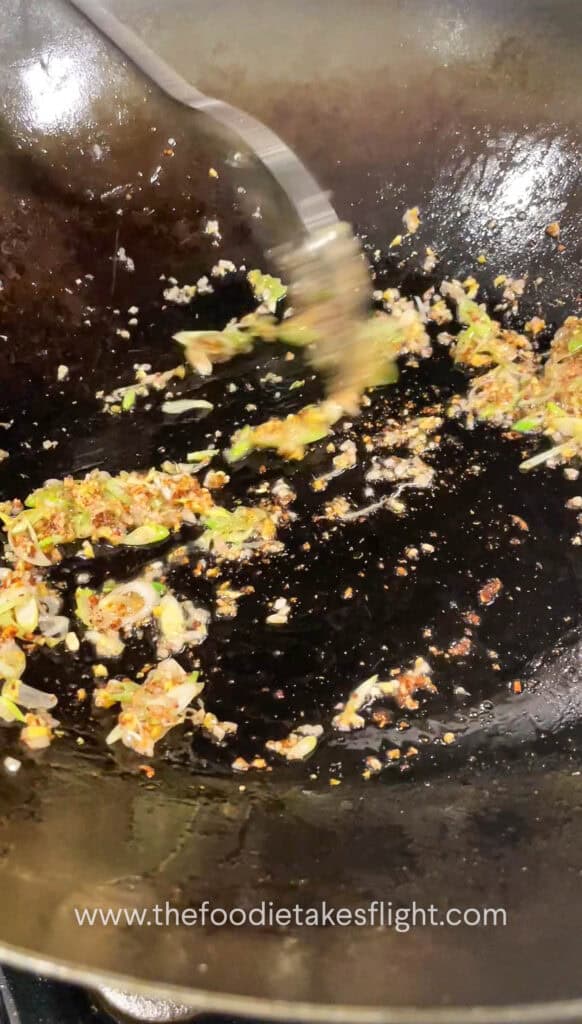 • Add in the ginger, garlic, shallots, and white parts of the scallion. Stir-fry for 30 seconds until aromatic. Add the Sichuan peppercorn and mix with the aromatics. Cook for 30 seconds.