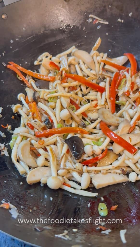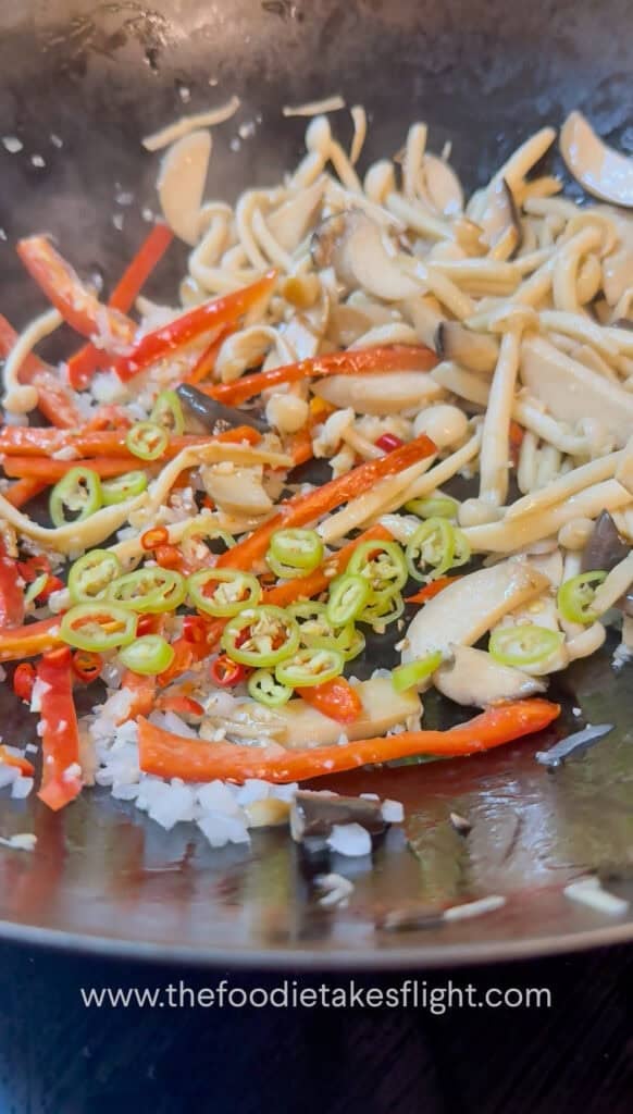 - Heat a large pan or wok over medium-high heat with some oil. Once hot, add the mushrooms and cook until these start to draw out moisture and start to brown. You can leave the mushrooms untouched to let these slightly char for extra flavor.