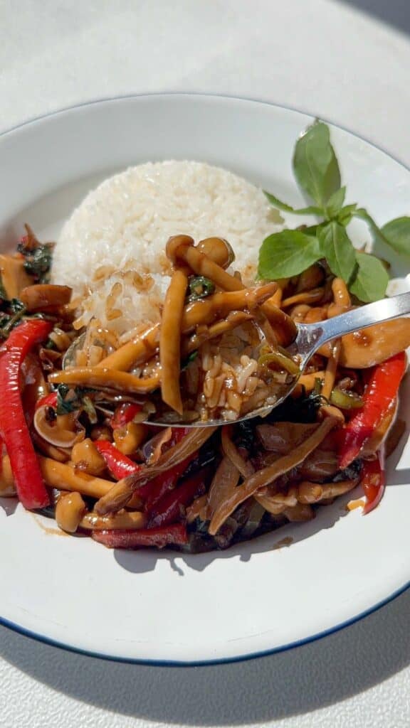 This is my plant-based take on the classic Thai dish, swapping the usual meat for a mix of mushrooms that soak up all that delicious sauce. I have a kra pao-inspired recipe on my blog using tofu that I cooked down to resemble minced meat. Check out my tofu kra pao recipe here.