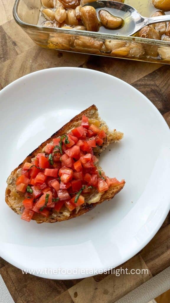 This Roasted Garlic and Tomato Bruschetta is simple, fragrant, and absolutely packed with flavor. I used roasted garlic confit and the leftover garlic-infused oil from my previous garlic confit recipe to create these golden, toasty bites layered with juicy tomatoes, basil, and a rich mash of garlic.
