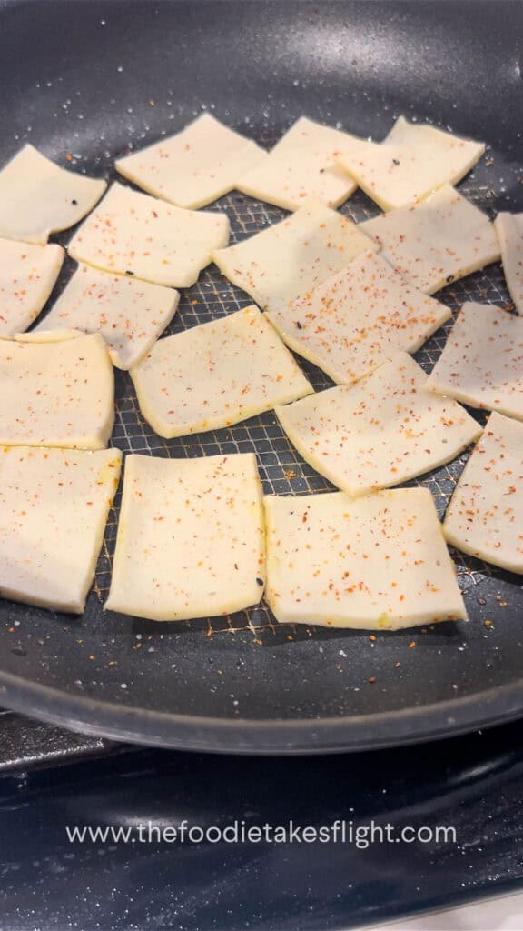 - On the same pan, heat oil to coat the pan. Once hot, add the thinly sliced tofu. Sprinkle salt and togarashi or Japanese spice blend. If using regular extra firm tofu, add some soy sauce, to taste.
