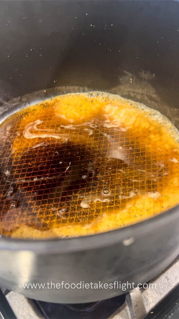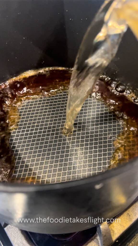 - Heat a medium sized pot. Once hot, add the mirin, soy sauce, and sugar. Mix well to dissolve the sugar. Add the shiitake mushroom broth from the soaked mushrooms.