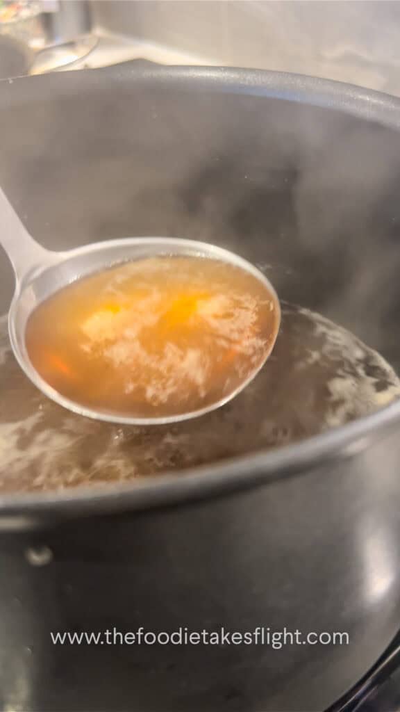 - Cover the pot and allow the broth to come to a boil. Lower and allow to simmer for 3-4 minutes.