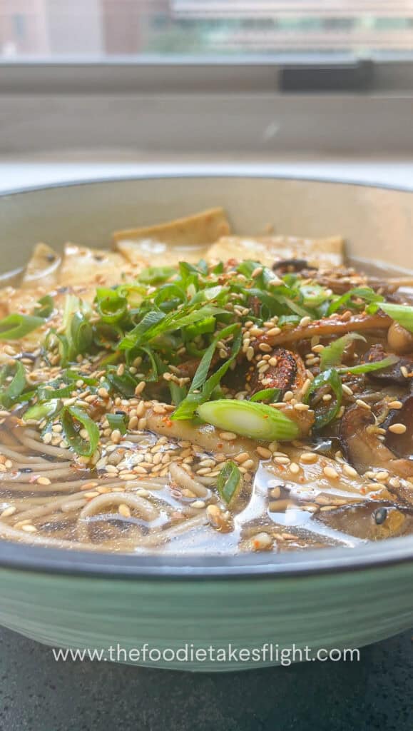 - Transfer the noodles to a bowl. Pour boiling hot broth over the noodles. Top with the mushrooms, tofu, green onions, sesame seeds, sesame oil, and togarashi. Serve while hot and enjoy!