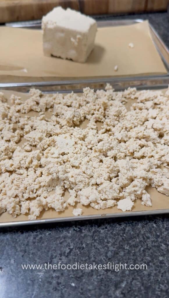 Sliced onions, bell peppers, and green chili with crumbled tofu stir-frying in a pan