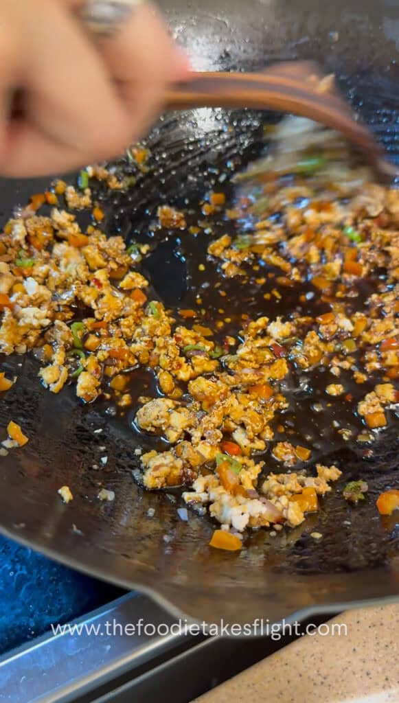 • In a bowl, mix together the calamansi juice, soy sauce, vegetarian oyster sauce, dark soy sauce, maple syrup, brown sugar, and doubanjiang.