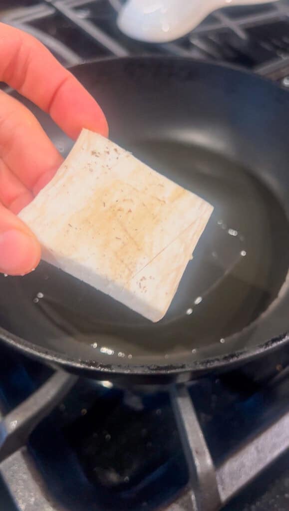 - In a small or medium non-stick pan, add a light layer of oil. Once hot, add the mushrooms sliced side down first.